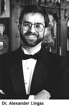 Dr Lingas, an alumnus of SVS, is assistant professor of music history at Arizona State University but is presently at the School of Historical Studies at the Institute for Advanced Study in Princeton, New Jersey, where he was awarded membership for the 2003-4 academic year. He holds a doctorate in Historical Musicology from the University of British Columbia and has completed postdoctoral study in Theology at the University of Oxford under the Rt. Rev. Dr Kallistos T. Ware. He is also director of music at St Katherine Greek Orthodox Church, Chandler, Arizona.