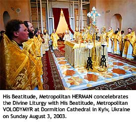 For the first time since his election as Primate of the Orthodox Church in America in July 2002, His Beatitude, Metropolitan Herman was welcomed here by His Beatitude, Metropolitan Volodymyr of Kyiv and All Ukraine as he began his first official visit to the Ukrainian Orthodox Church on Saturday, August 2.