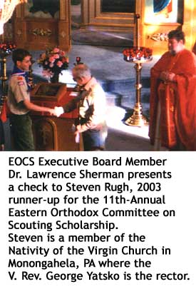The Eastern Orthodox Committee on Scouting [EOCS] 2004 scholarship program is being offered to high school Boy and Girl Scout seniors of the Eastern Orthodox Church. The scholarships are made possible by the EOCS Scholarship Endowment Fund and are not based on need. Annually the EOCS awards $1,000 for first place and $500 for the runner-up.